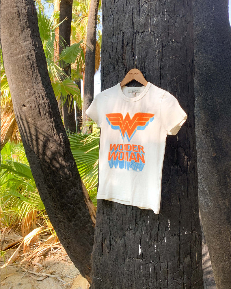 Nothing's better than a classic, right? The Women's WONDER WOMAN™ Classic Logo Tee in Vintage White features the classic DC WONDER WOMAN™ logo in red and blue on a clean, white short-sleeve crewneck tee. This Original Tee is our authentic, slim-fit tee made with our signature, super soft tri-blend and finished with grinding to give it that vintage touch.