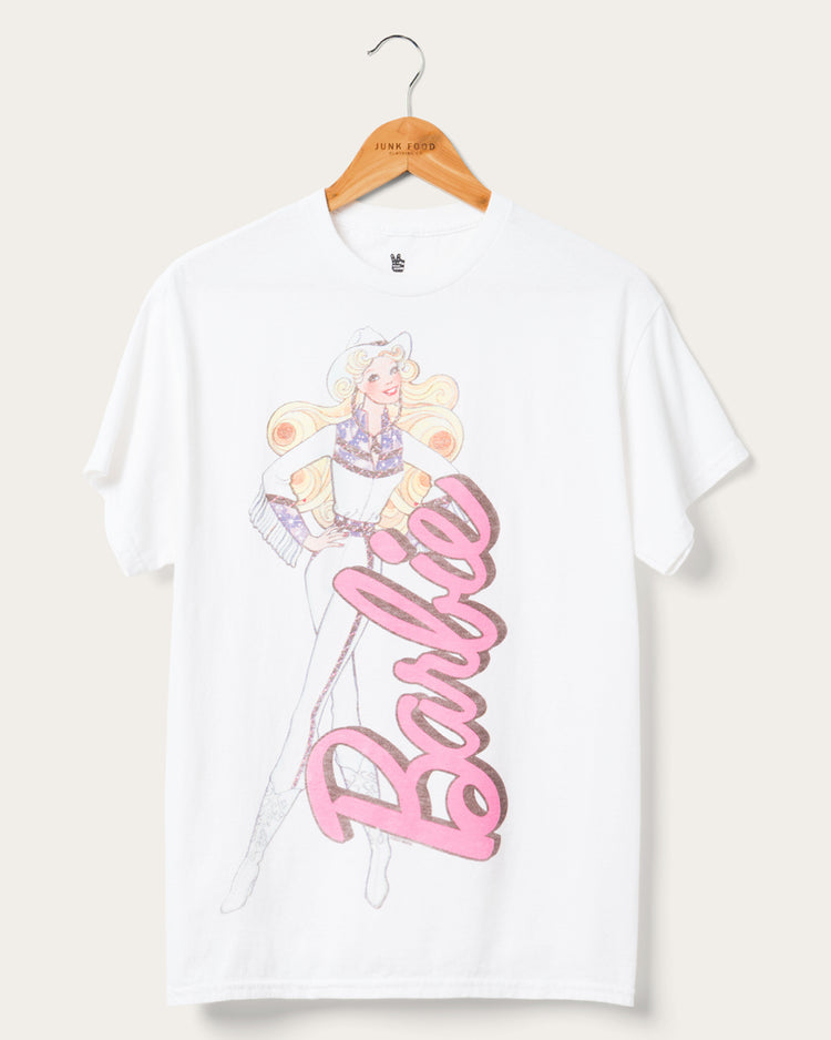 Saddle up in style with the Women's Cowgirl Barbie Flea Market Tee. Showcasing vintage Barbie designs and a touch of western flair, this tee captures the essence of adventure and fashion. Whether strolling the city streets or country trails, channel your inner cowgirl with this playful and iconic piece.