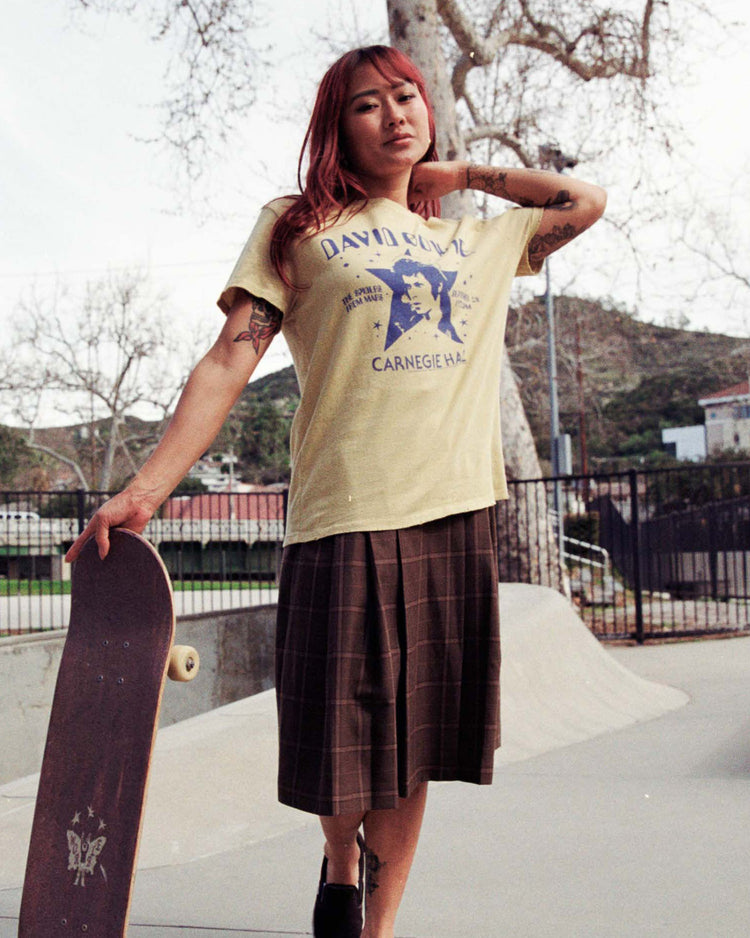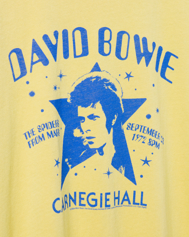 Step into the musical legacy of David Bowie with our Women's David Bowie Carnegie Hall Vintage Tee. Inspired by Bowie's iconic performance at Carnegie Hall, this distressed tee combines vintage charm with timeless rock. Snag a piece of history with a tee that pays homage to a legendary artist and the magic of this live performance.