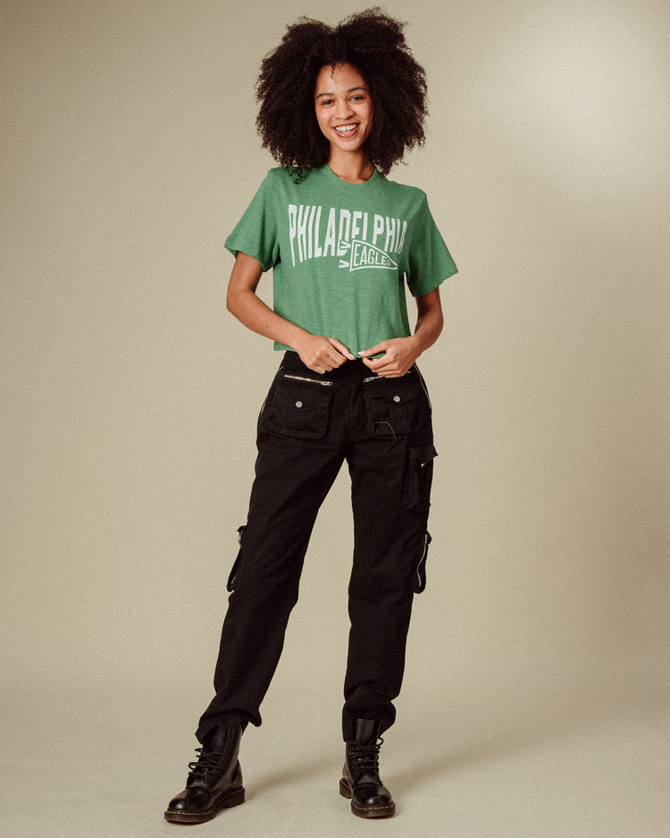 Unleash your dual threat style with the Women's Philadelphia Eagles Dual Threat Mock Neck Crop. This trendy piece redefines game day fashion, seamlessly blending sporty vibes with a chic silhouette. Celebrate your Eagles pride in a crop top that's as dynamic as your team. Elevate your wardrobe with this fashion-forward tribute to football fandom.
