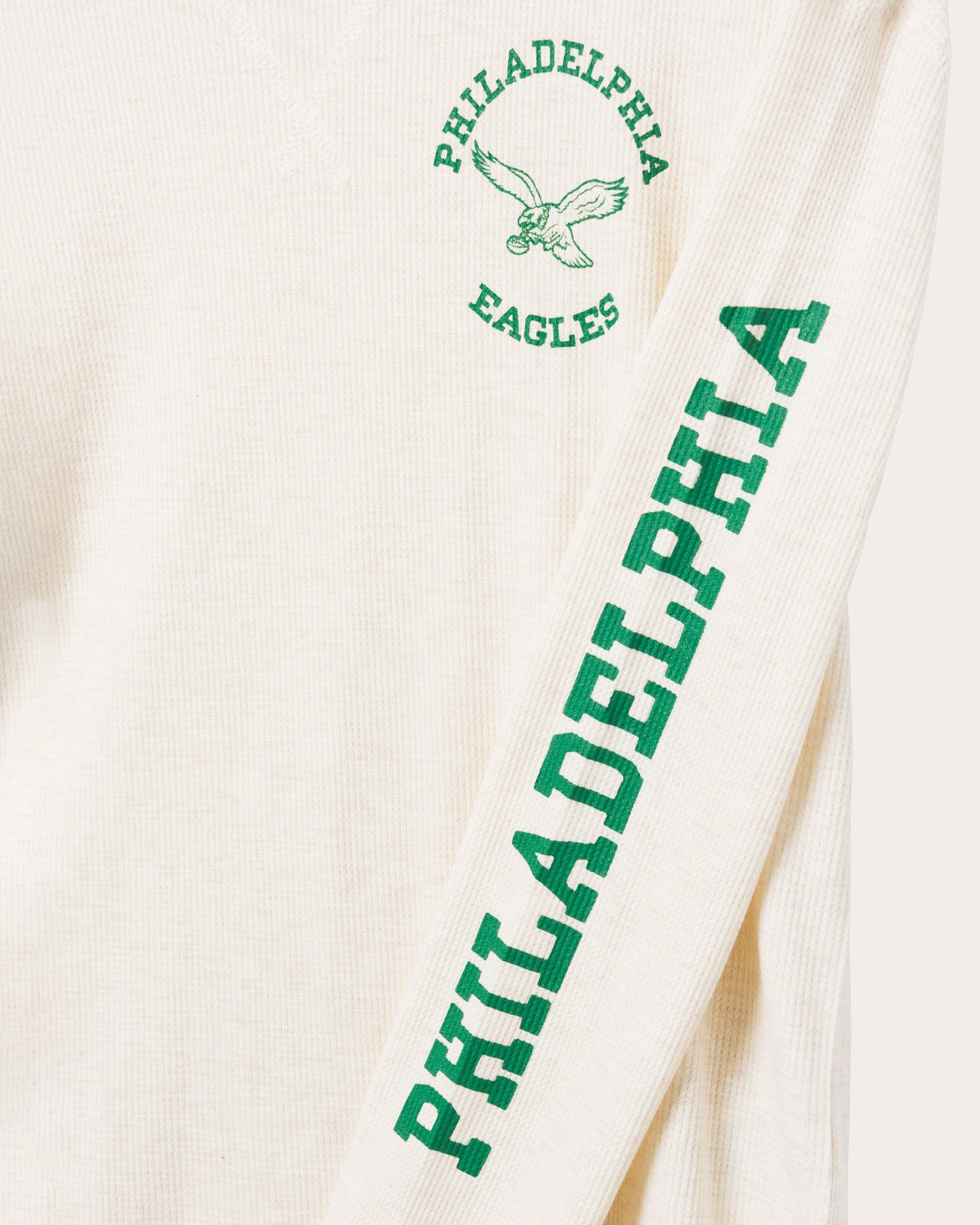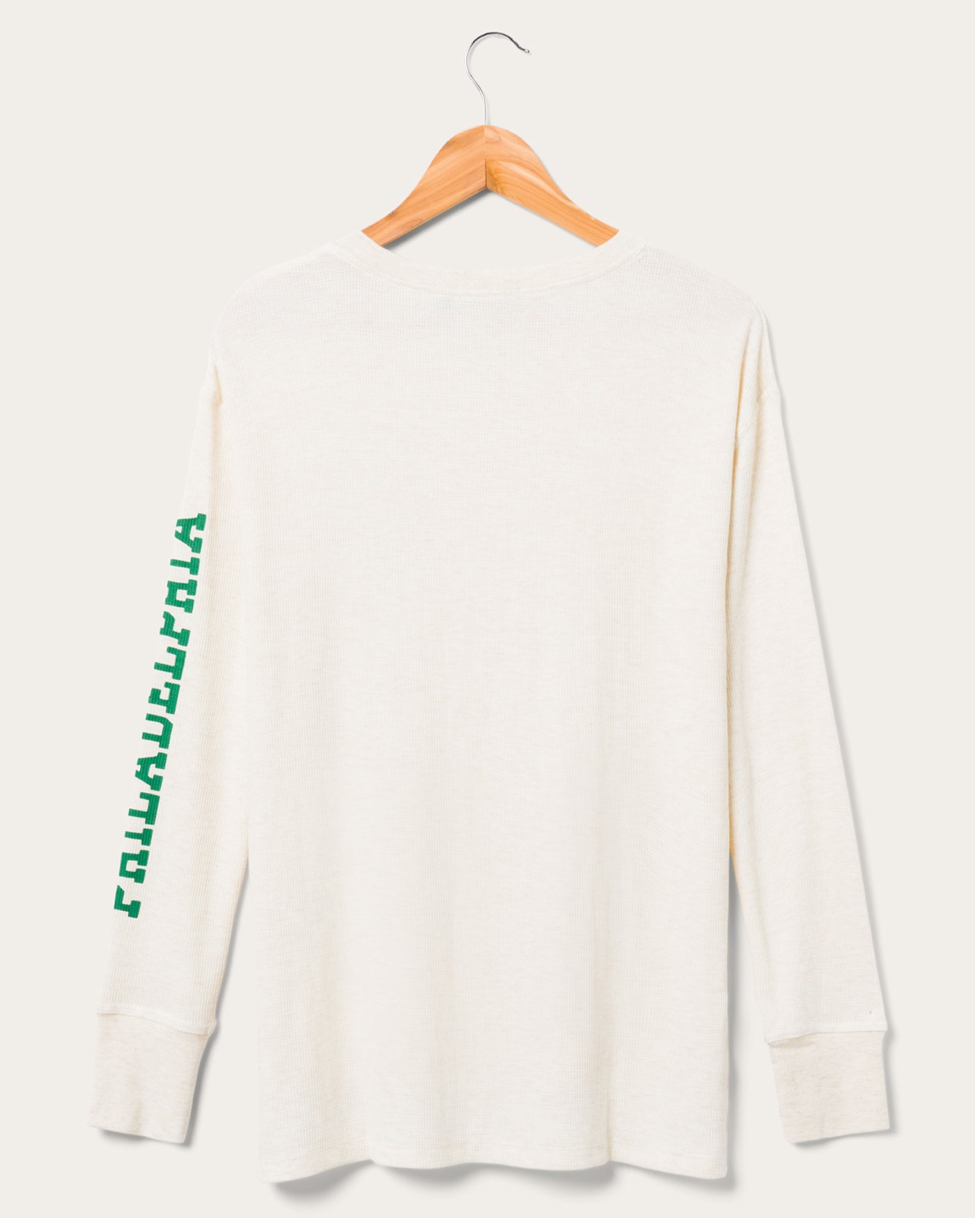 We have exactly what you need for those cold months with our Women’s Eagles Timeout Thermal. Featuring a small graphic on the left chest and a Philadelphia text hit on the left sleeve. This thermal has comfort, warmth, and style all wrapped up into one shirt!