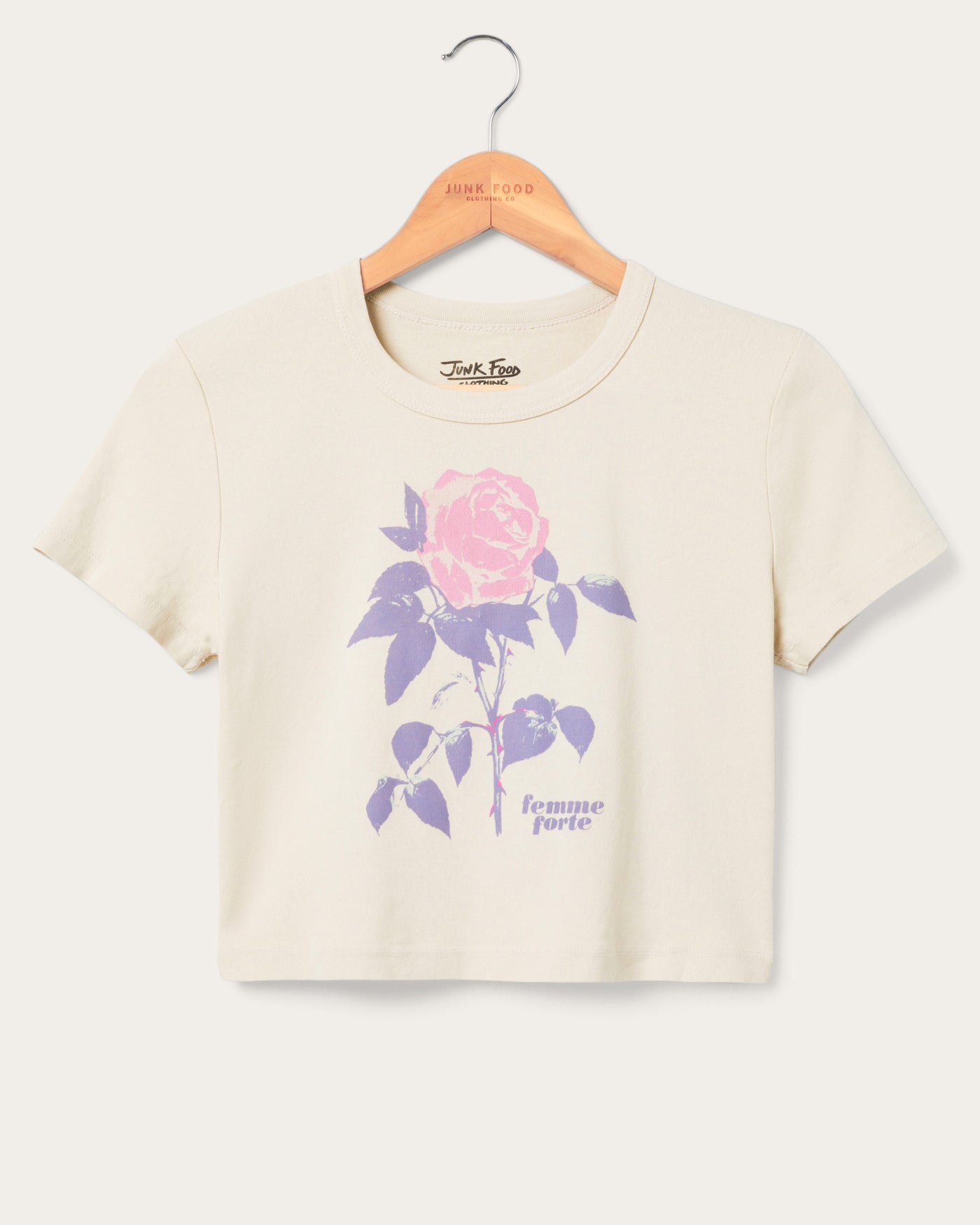 Show your strength and style with our Women’s Femme Forte Rose Baby Tee! Featuring a delicate rose graphic and bold "Femme Forte" lettering, this fitted tee combines elegance with empowerment. Crafted from soft, stretchy fabric, it’s perfect for layering or making a statement all on its own.
