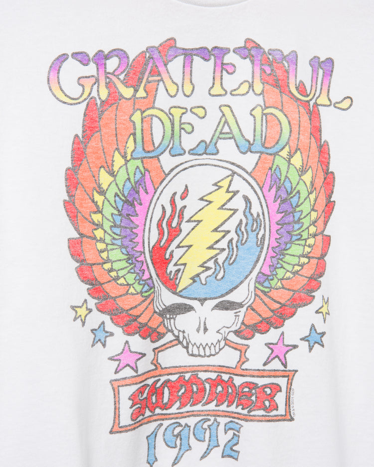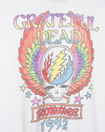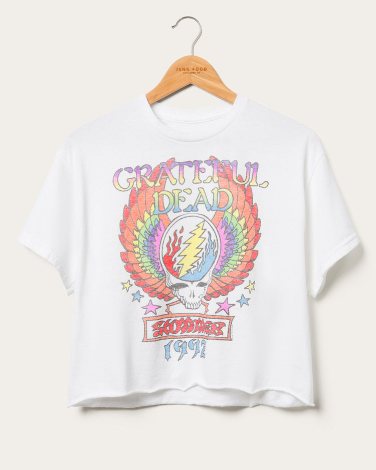 Get ready to rock the retro look with our Women's Grateful Dead Winged Skull Flea Market Crop Tee! This eye-catching tee shirt features a cool design that is sure to turn heads. Made with high-quality materials, this crop tee is comfortable, stylish, and perfect for any Grateful Dead fan.