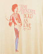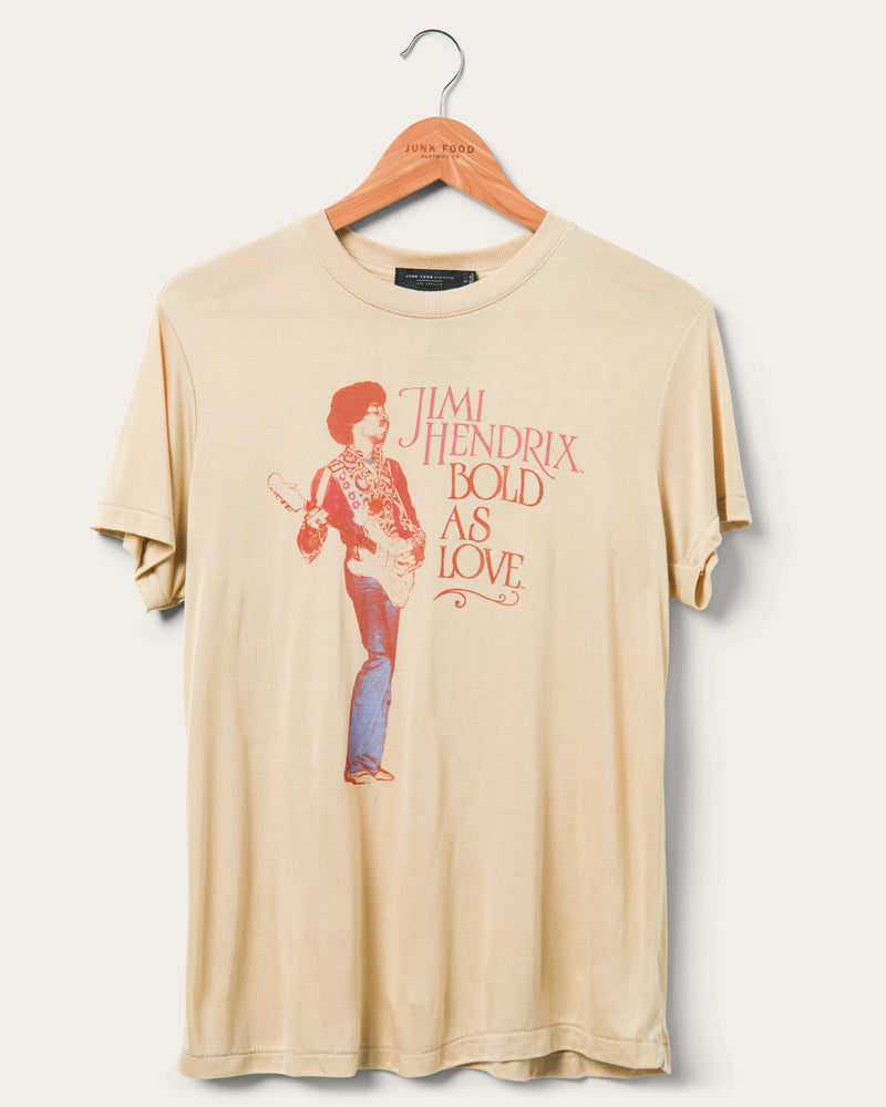 Rock to the beat in our Women's Jimi Hendrix Bold as Love Vintage Tissue Tee in Camel. This tee features Jimi jammin' on his guitar in a multi-color soft-hand graphic. Our barely-there relaxed fit Vintage Tissue is ultra light weight and made of 100% micro modal.