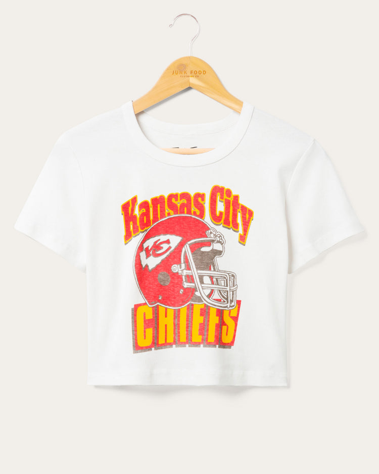 Rep your Chiefs pride in style with this women’s baby tee cropped, comfy, and seriously cute. Featuring the iconic Kansas City logo, it's perfect for game day or any day. Soft stretch fabric hugs just right. Pair it with denim or joggers and let your fandom shine loud and proud!