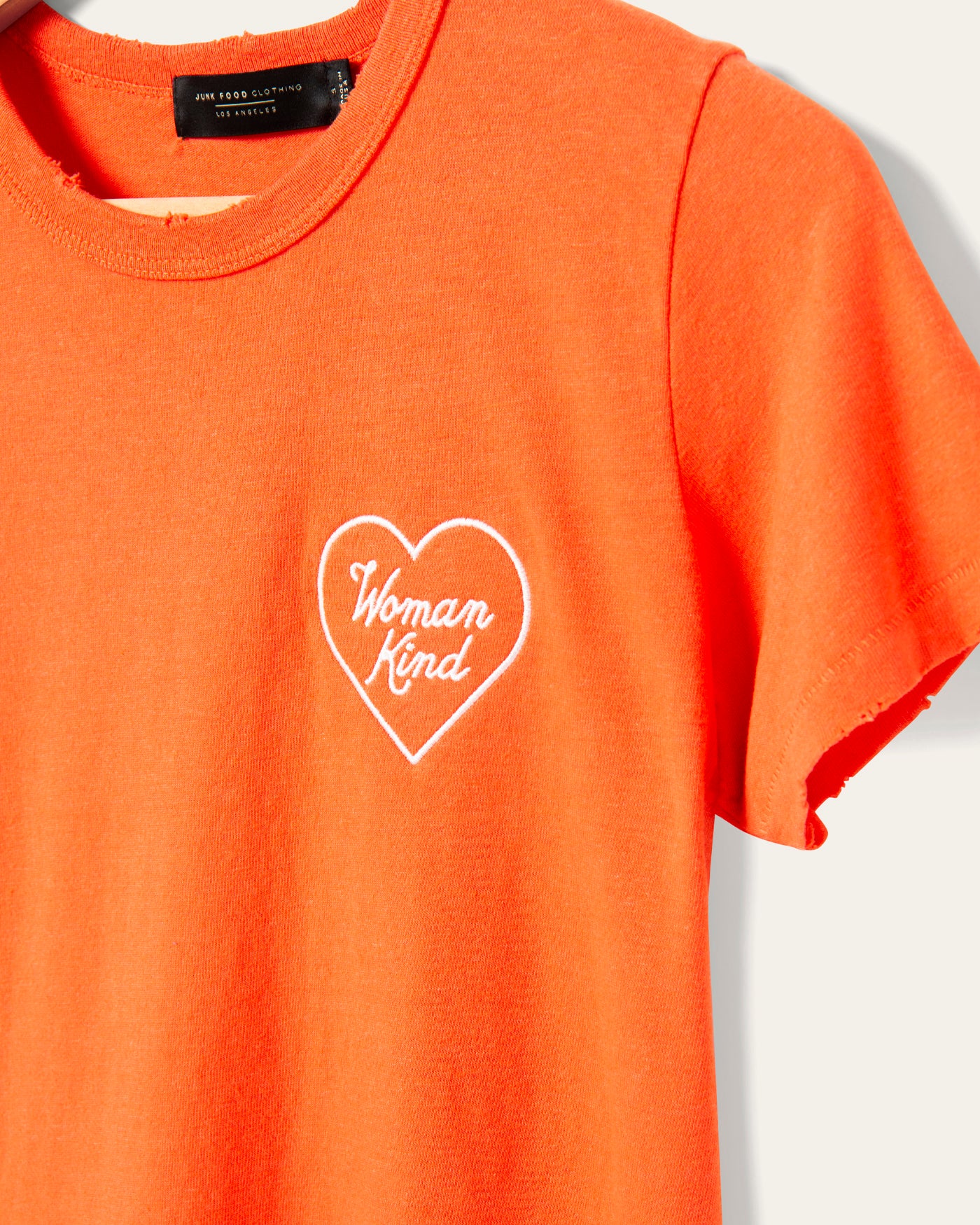 Radiate positivity in our Women's "Woman Kind" Original Tee. Featuring a vintage-inspired Woman Kind heart embroidery on a bold red-orange tee. This soft, lived-in tee is all about effortless style with a distressed finish. Delicate embroidered details add texture and depth, making this piece as unique as the message it carries. Perfectly relaxed and endlessly empowering—because kindness never goes out of fashion.