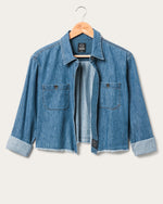 Made in a premium, featherweight Hemp Denim blend, featuring a medium wash with a relaxed, boxy fit. The cropped length has a raw-cut hem with frayed edges. Classic design elements include: double chest pockets, back yoke seam with a box pleat, while signature details include: branded gunmetal buttons, JF Heritage Smiley logo label at interior center front placket & our signature mitered corner pocket with zig-zag stitching.