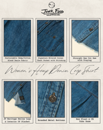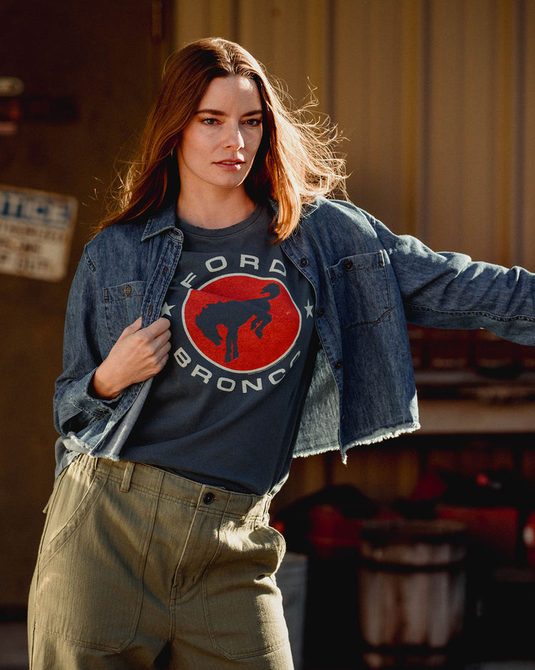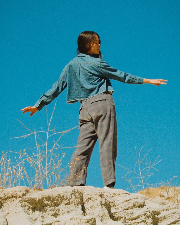 Our modern, feminine take on a heritage denim shirt. This vintage-inspired crop looks effortlessly cool & is the perfect light layer to wear alone or throw over all your favorite JF tees along with any of our unisex pants for a full Junk Food look. Model's outfits feature the Unisex Straight Twill Plaid Pant & The Utility Twill Straight Pant.