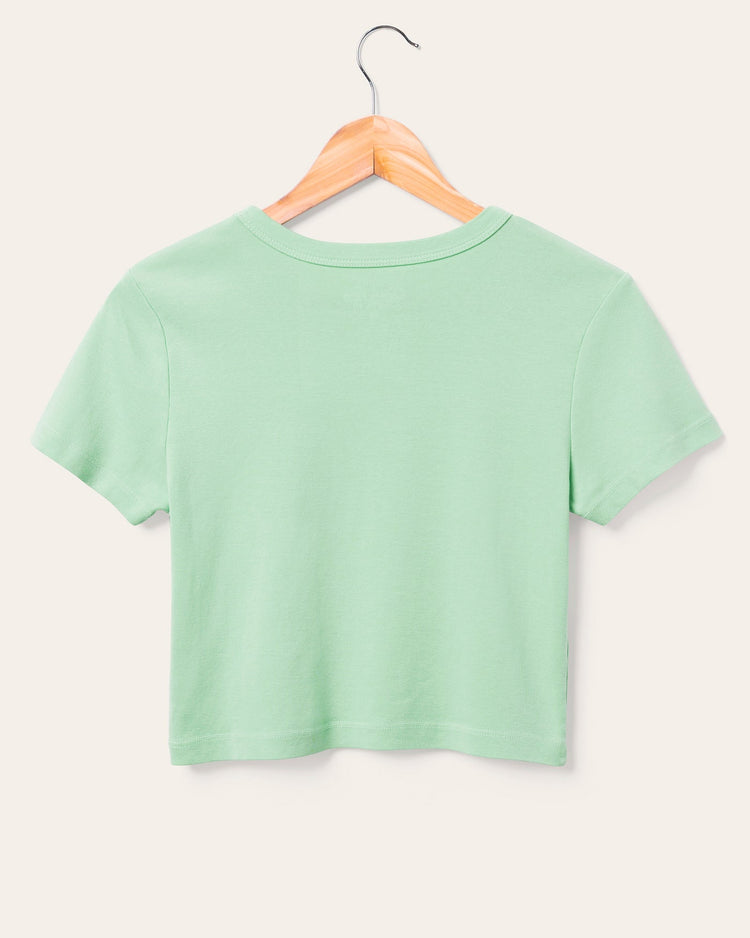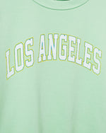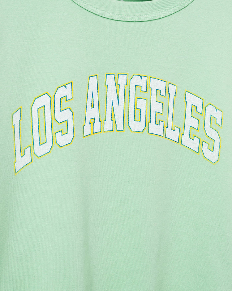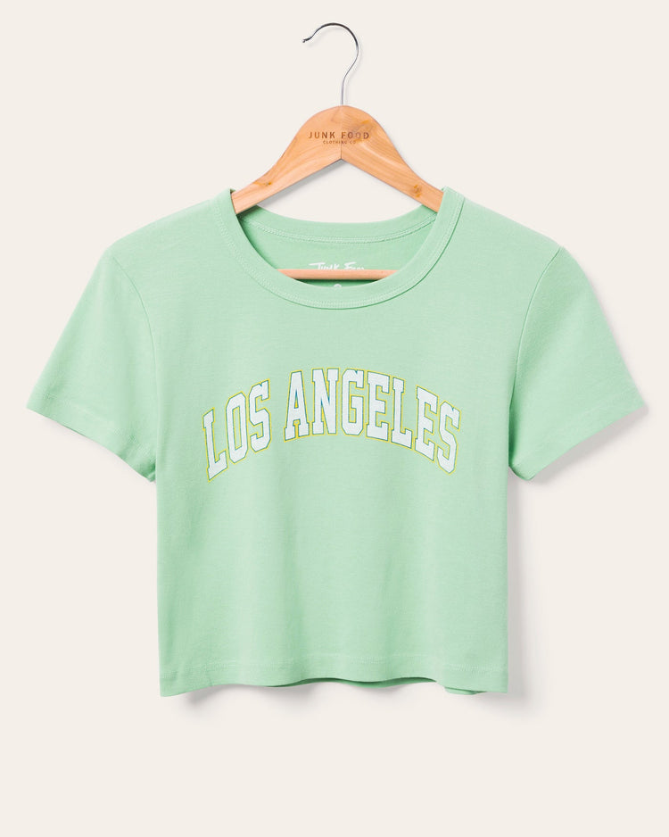 Elevate your casual style with this Women's Los Angeles Baby Tee in fresh minty green. Made from ultra-soft fabric, it features a chic cropped fit and bold varsity-inspired lettering. Perfect for layering or pairing with high-waisted denim, this tee brings effortless SoCal vibes to any look!