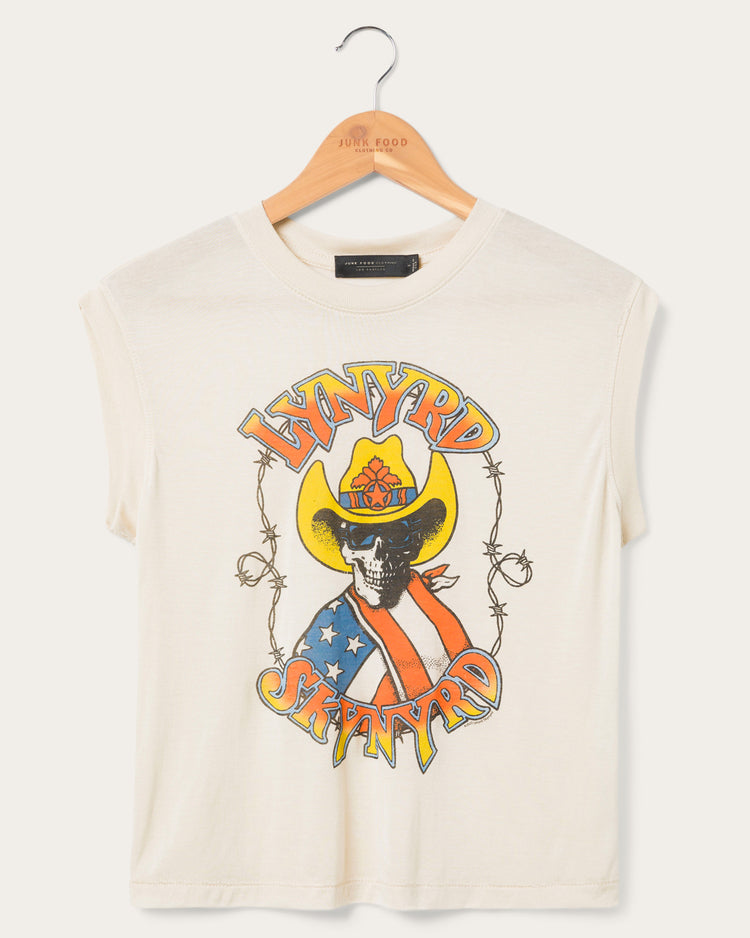 Our Women’s Lynyrd Skynyrd Skull Cowboy Vintage Tissue Tank delivers Southern rock attitude with a perfectly worn-in feel. Featuring a bold skull cowboy graphic on ultra-light, soft fabric, this tank is effortlessly cool and made for laid-back days. A must-have for Skynyrd fans and vintage lovers alike.