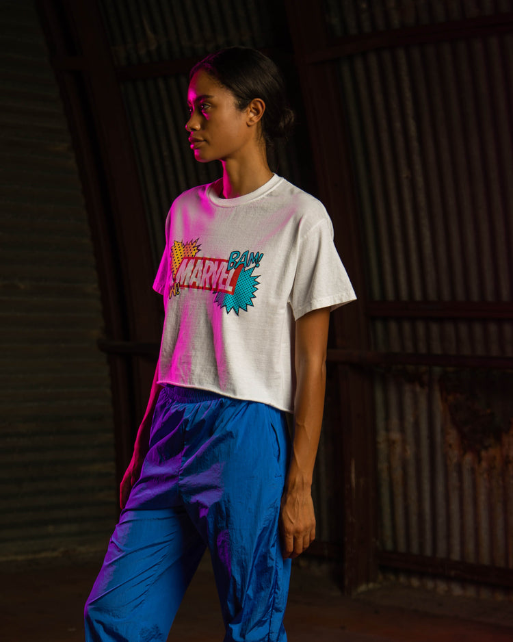 Comin' atcha Pop Art style in our Flea Market Crop Tee. We couldn’t resist layering the classic Marvel logo with the quintessential BAM! POW! for a fun, comic-style tee. Nostalgic, but trendy in all the right ways.