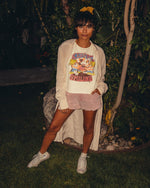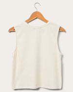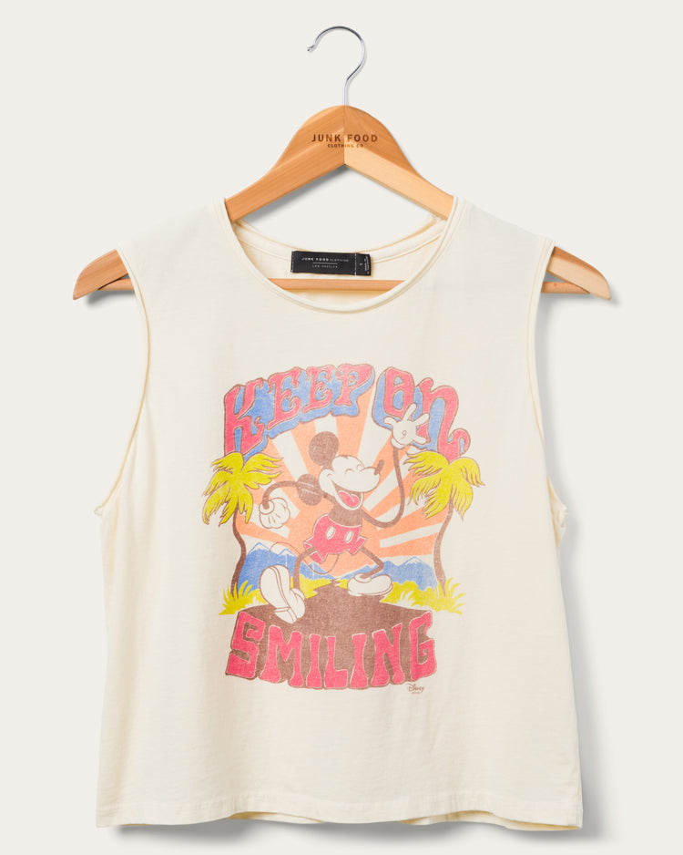 We're all smiles in this Women's Mickey Keep Smiling Muscle Tank in off-white color Birch. Featuring a multi-colored graphic of our favorite Disney mouse set against a colorful setting sun. The Women's Muscle Tank is made of 100% mid-weight cotton and features a raw cut neck and sleeve bands. The cropped length and boxy fit make this the best tee to pair with high-waisted denim.