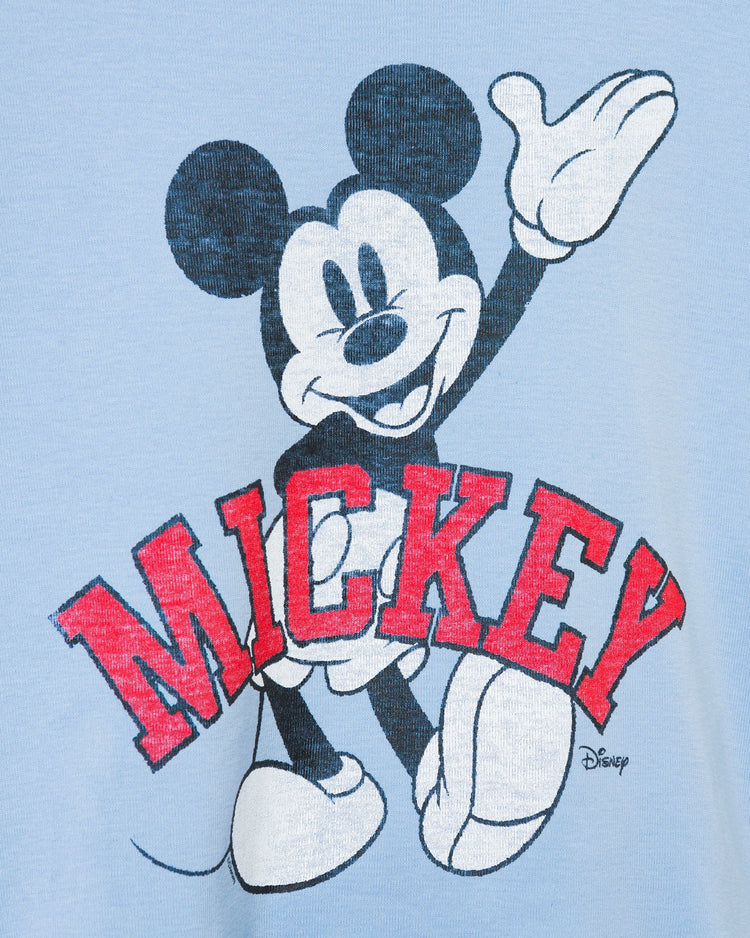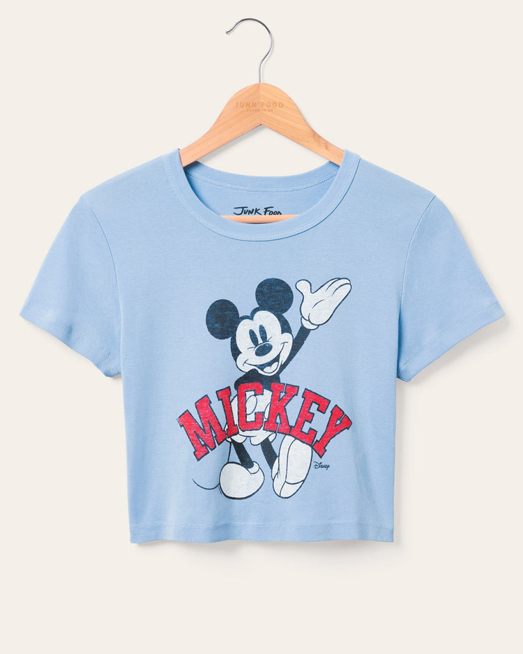 Bring on the nostalgia with the Women's Mickey Wave Baby Tee in a breezy sky blue. Featuring a cheerful Mickey Mouse graphic and bold retro lettering, this cropped tee is the perfect blend of playful charm and everyday comfort. Pair it with your favorite sneakers for a touch of Disney magic!