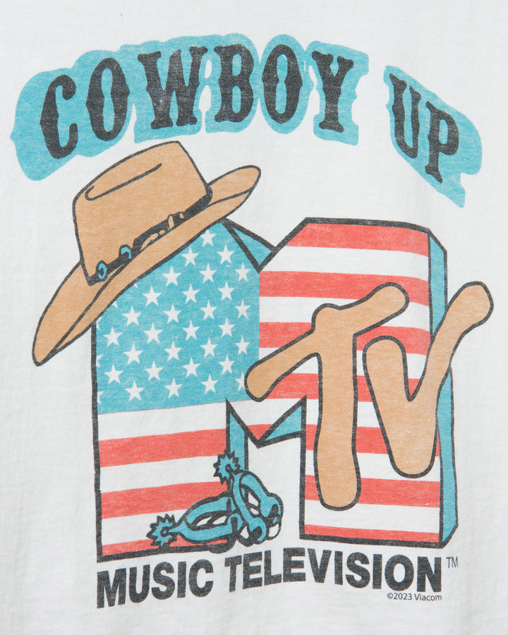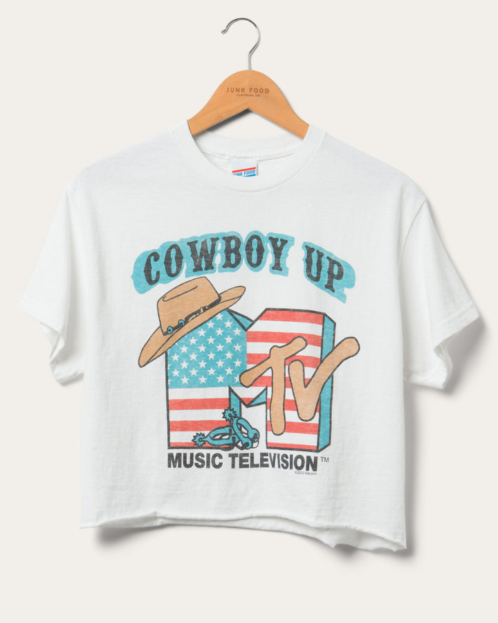 Giddy up cowboy and ride on into our Women's MTV Cowboy Flea Market Crop Tee. Made out of 100% authentic heavyweight cotton for that relaxed cropped fit. Featuring a patriotic vintage inspired MTV graphic on the front of the tee. Its a good time to be a cowboy!
