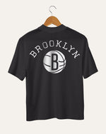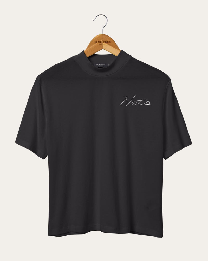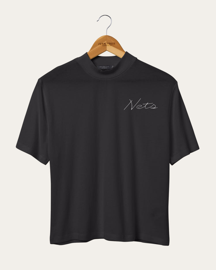 Wearing our Women's NBA Mock Neck tee is the ideal way to rep your favorite team. Consisting of 100% heavy weight textured cotton, featuring a satin stich embroidered logo on the left chest and a graphic print on the back, this relaxed close fit tee is the perfect fusion of style and comfort for any fan. Go Nets!