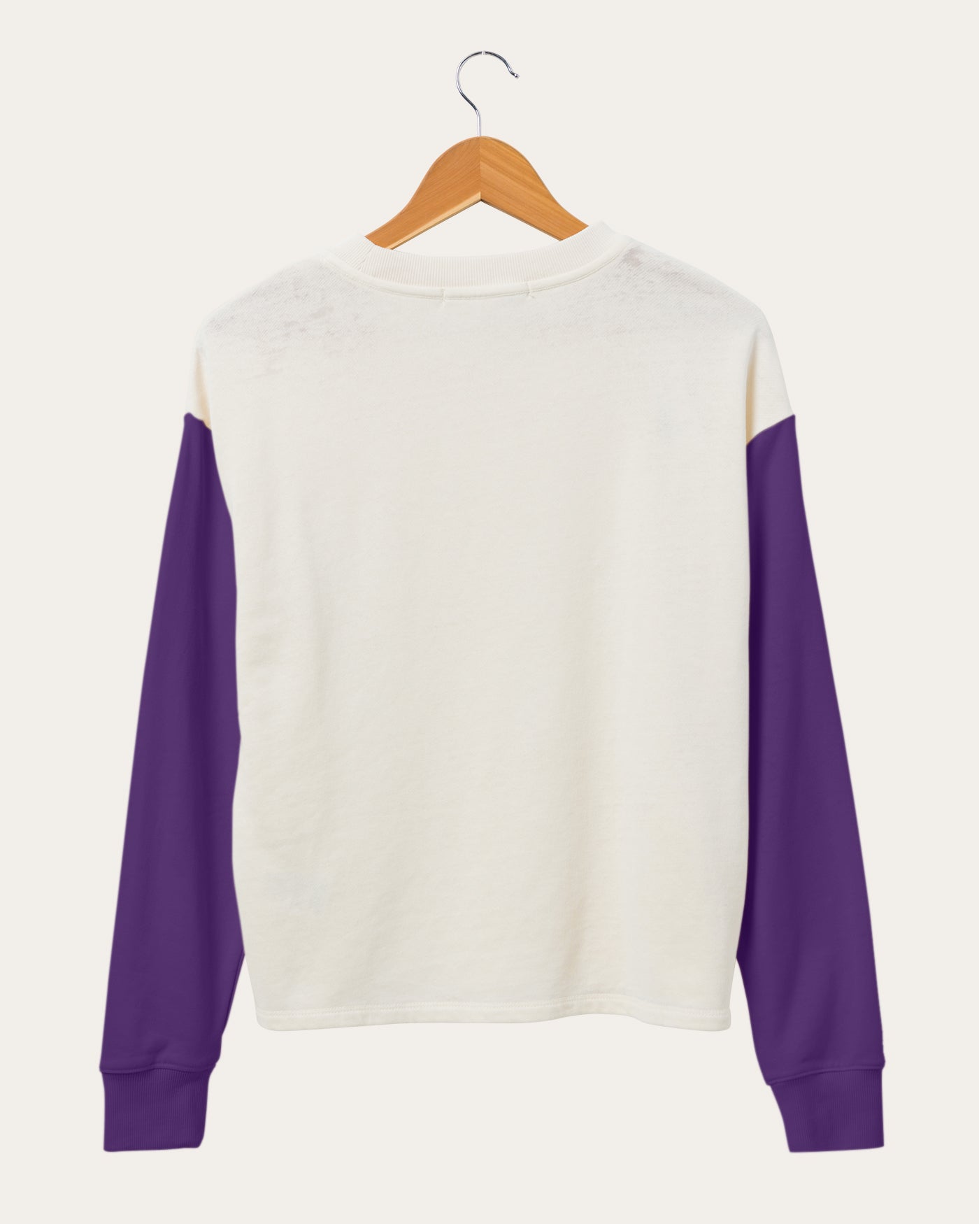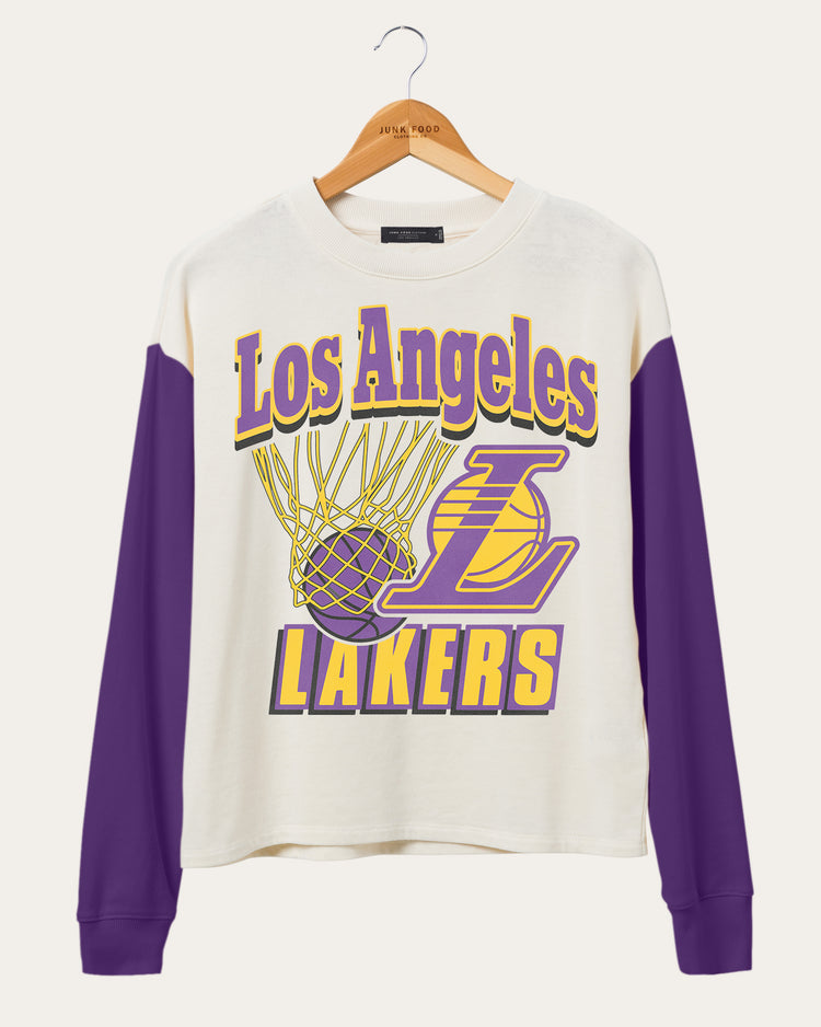 She shoots she scores! Wearing our Women's Contrast Sleeve Crewneck is the perfect way to look stylish and sporty. Featuring a super soft blend of 70% cotton and 30% polyester, with a contrast color sleeve and an oversized graphic print on the front. This is the perfect crewneck for any occasion. Go Lakers!