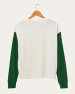 She shoots she scores! Wearing our Women's Contrast Sleeve Crewneck is the perfect way to look stylish and sporty. Featuring a super soft blend of 70% cotton and 30% polyester, with a contrast color sleeve and an oversized graphic print on the front. This is the perfect crewneck for any occasion. Go Bucks!