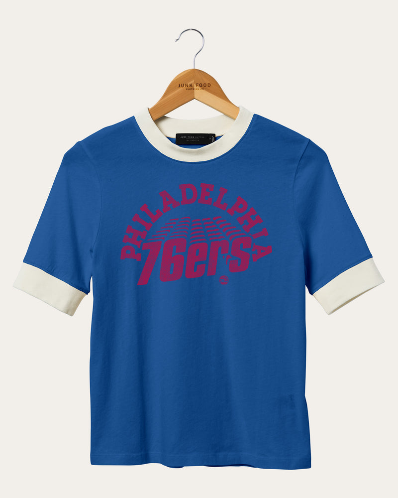 Lets go Sixers! Rep the City of Brotherly Love with our Women's NBA Slim Ringer Tee. Featuring a signature loose knit 100% cotton jersey. With a relaxed close fit, extended sleeve length, and a vintage graphic print across the center, this tee is perfect for any occasion.
