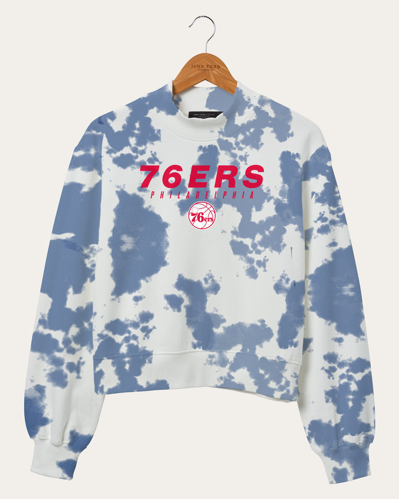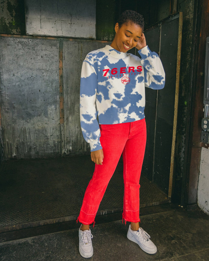 Check it out! We are bringing the classic tie dye style to the new age. Our NBA Tie Dye Mock Neck Long Sleeve is made of a blend of 80% heavy weight peached fleece cotton and 20% polyester, featuring a stylish tie dye treatment, the fine graphic printed logo featuring front and center on the chest, this cropped fit long sleeve is perfect for hanging out at home or a night out. Go 76ers!