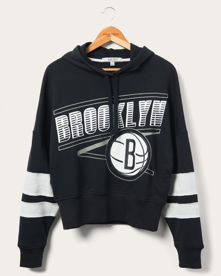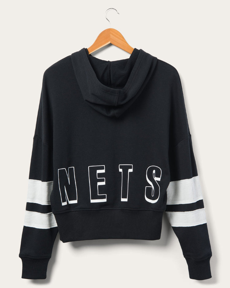 For the game days you're looking to feel stylish, but ultimately cozy. Our Women's Nets Overtime Striped Fleece Hoodie in True Black has got you covered for an easy throw-on piece for home, bar or arena. Made in our super soft blended French Terry & sporting a boxy, cropped fit for a modern update to your hoodie collection.