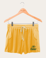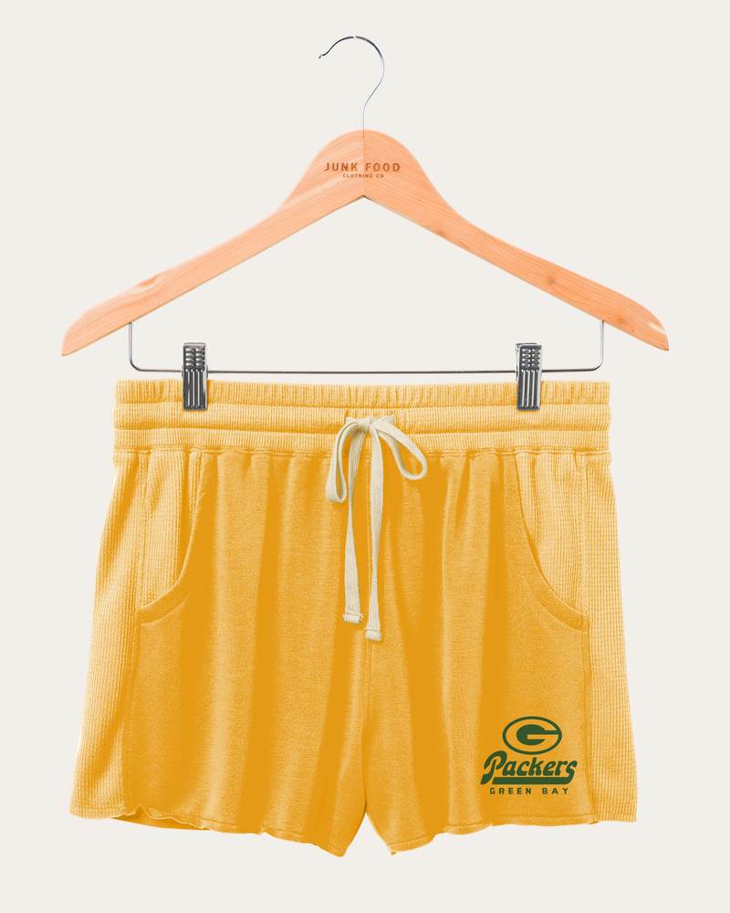 It's time to get comfortable in our Women's NFL Green Bay Packers Fabric Mix Thermal Shorts. These are constructed with a super soft rayon/poly/spandex fabric blend. They also feature pockets and a graphic logo on the wearer’s left. These shorts are ideal for just lounging around or quick trips out.