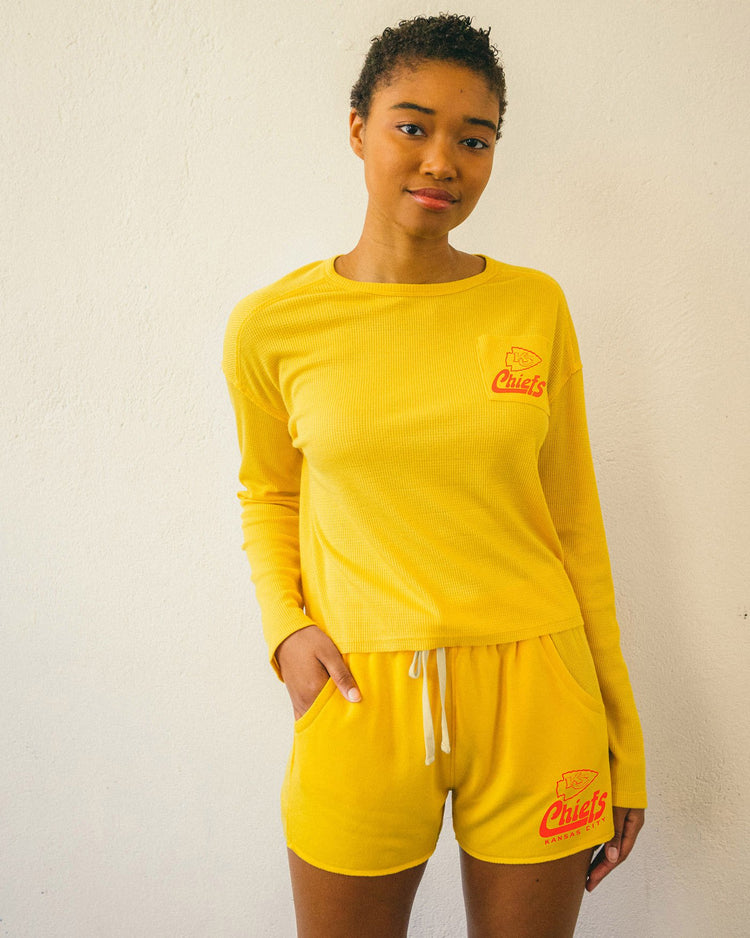 It's time to get comfortable in our Women's NFL Kansas City Chiefs Fabric Mix Thermal Shorts. These are constructed with a super soft rayon/poly/spandex fabric blend. They also feature pockets and a graphic logo on the wearer’s left. These shorts are ideal for just lounging around or quick trips out.