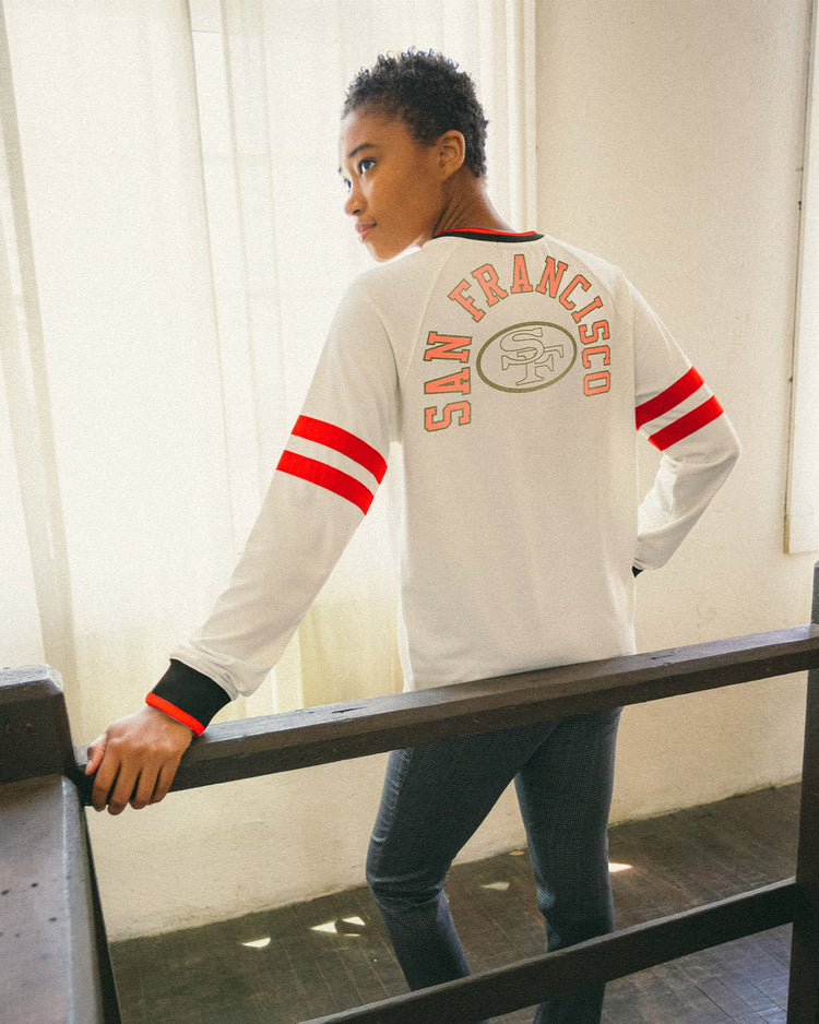 Become a part of the team with our Women's NFL San Francisco 49ers Long Sleeve Football Crewneck. Made from our super soft poly/rayon/spandex blend and featuring a graphic print on the front and the back of the crewneck, and contrast sleeve stripes. This crewneck is a perfect addition to your game day outfit rotation.