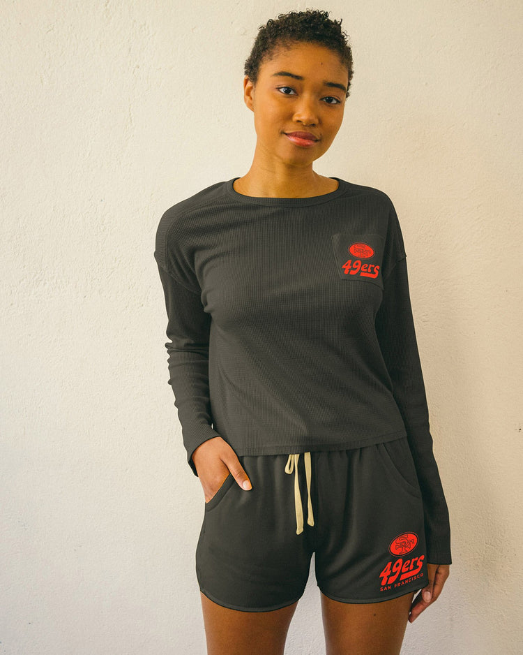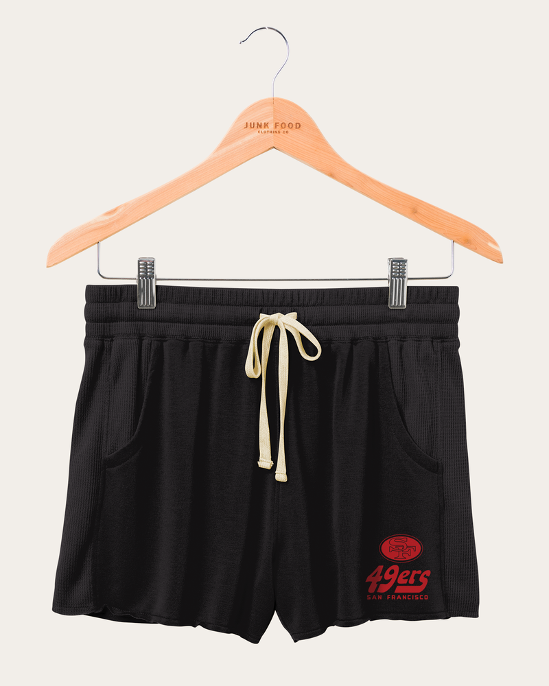 It's time to get comfortable in our Women's NFL San Francisco 49ers Fabric Mix Thermal Shorts. These are constructed with a super soft rayon/poly/spandex fabric blend. They also feature pockets and a graphic logo on the wearer’s left. These shorts are ideal for just lounging around or quick trips out.
