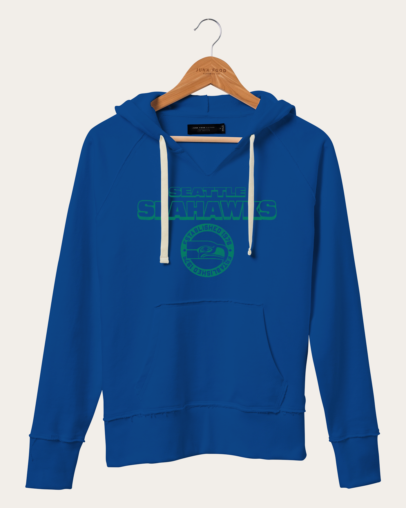 Stay cozy in our Women's NFL Seattle Seahawks Raw Edge Hoodie. This fleece is made from a midweight peached French terry cotton/poly fabric blend. It features a raw edge v-notch on the neckline and raw edge details on the hem, sleeve, and kangaroo pocket. The graphic is front and center on the chest. This is a hoodie that every fan should have in their closet.