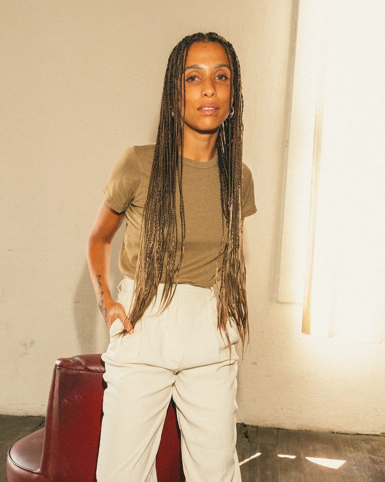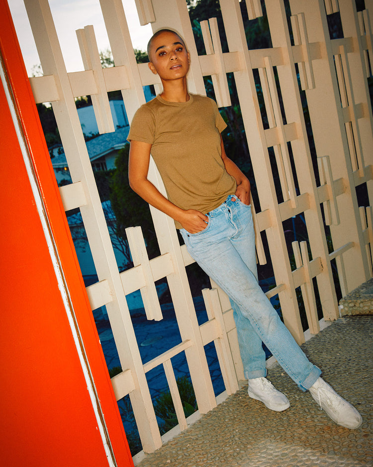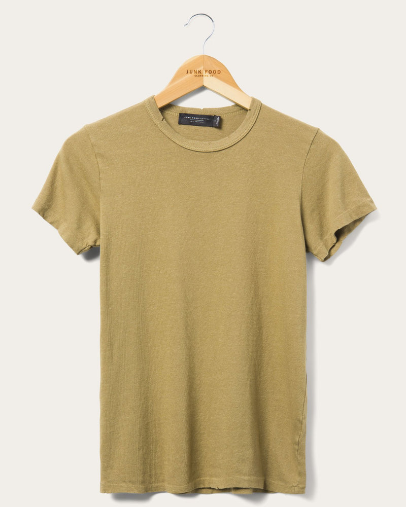 Made in our cozy signature tri-blend jersey, finished with garment dye & softener wash. Featuring a classic crew neck with ladder stitching details & intentionally distressed at the neck, sleeve & hem.
