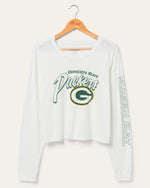 Score big on style with our Women's Packers Touchdown Long Sleeve Crop Tee! This trendy crop top combines comfort and team pride, featuring a bold officially licensed Packers logo. Perfect for game day or casual outings, show off your Packers spirit with flair. Get yours and cheer in style!