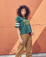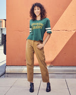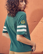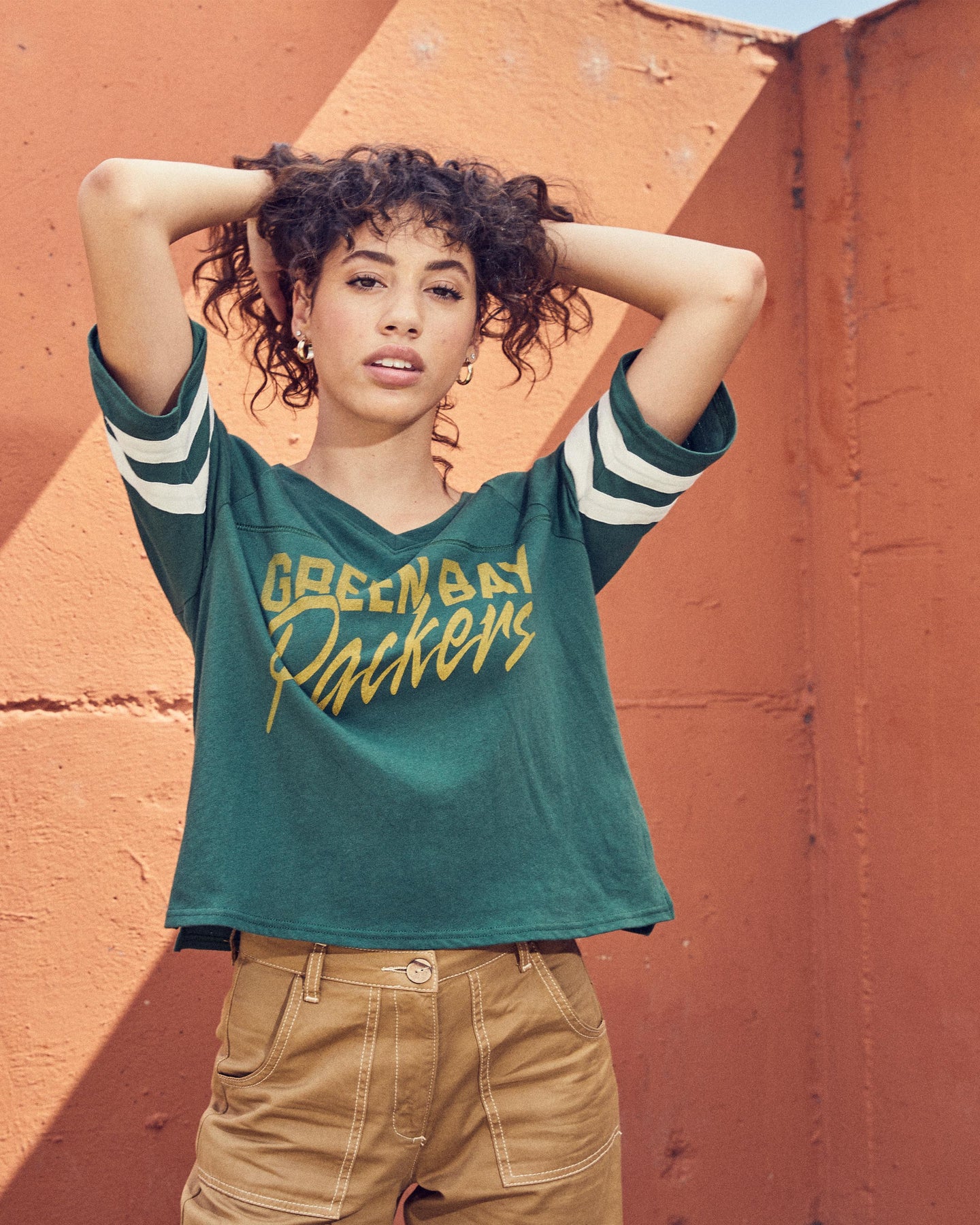 Ladies, time to throw out those huge, gross jerseys! Our vintage jersey inspired tee is made just for you! All the classic seaming details & v-neck shape, but on a slightly boxy, cropped silhouette makes this the ultimate feminine game-day tee. Featuring the Green Bay Packers on the front, logo on the sleeve, and topped on contrast sleeve stripes, all in our signature super soft cotton.