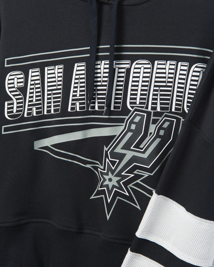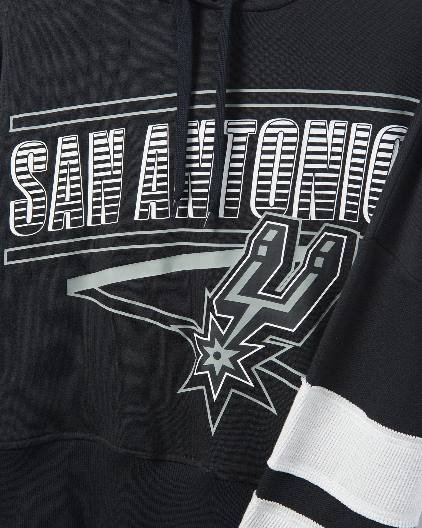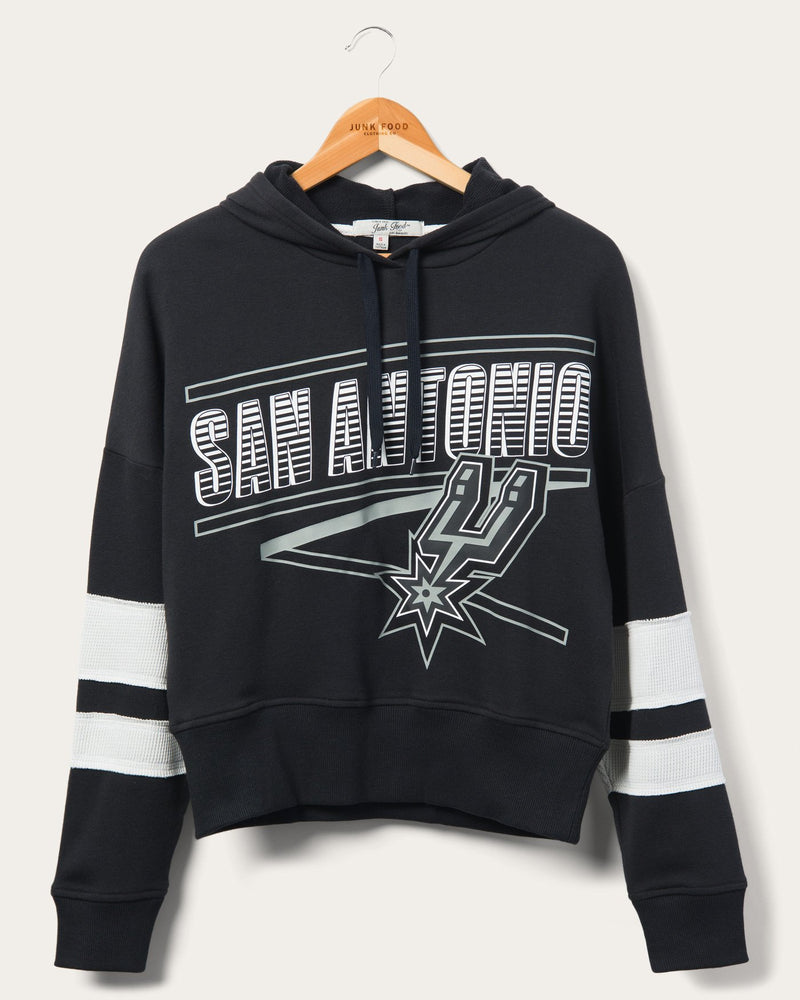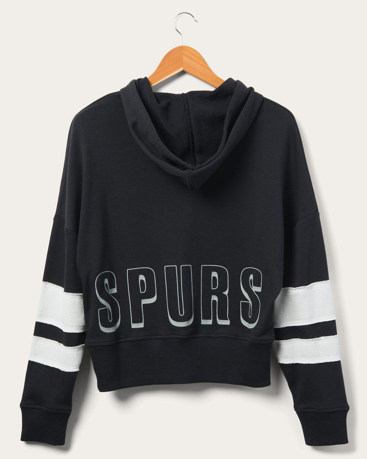 For the game days you're looking to feel stylish, but ultimately cozy. Our Women's Spurs Overtime Striped Fleece Hoodie in True Black has got you covered for an easy throw-on piece for home, bar or arena. Made in our super soft blended French Terry & sporting a boxy, cropped fit for a modern update to your hoodie collection.