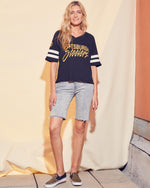Ladies, time to throw out those huge, gross jerseys! Our vintage jersey inspired tee is made just for you! All the classic seaming details & v-neck shape, but on a slightly boxy, cropped silhouette makes this the ultimate feminine game-day tee. Featuring the Pittsburgh Steelers on the front, logo on the sleeve, and topped on contrast sleeve stripes, all in our signature super soft cotton.