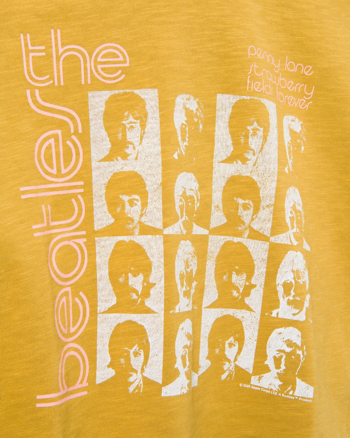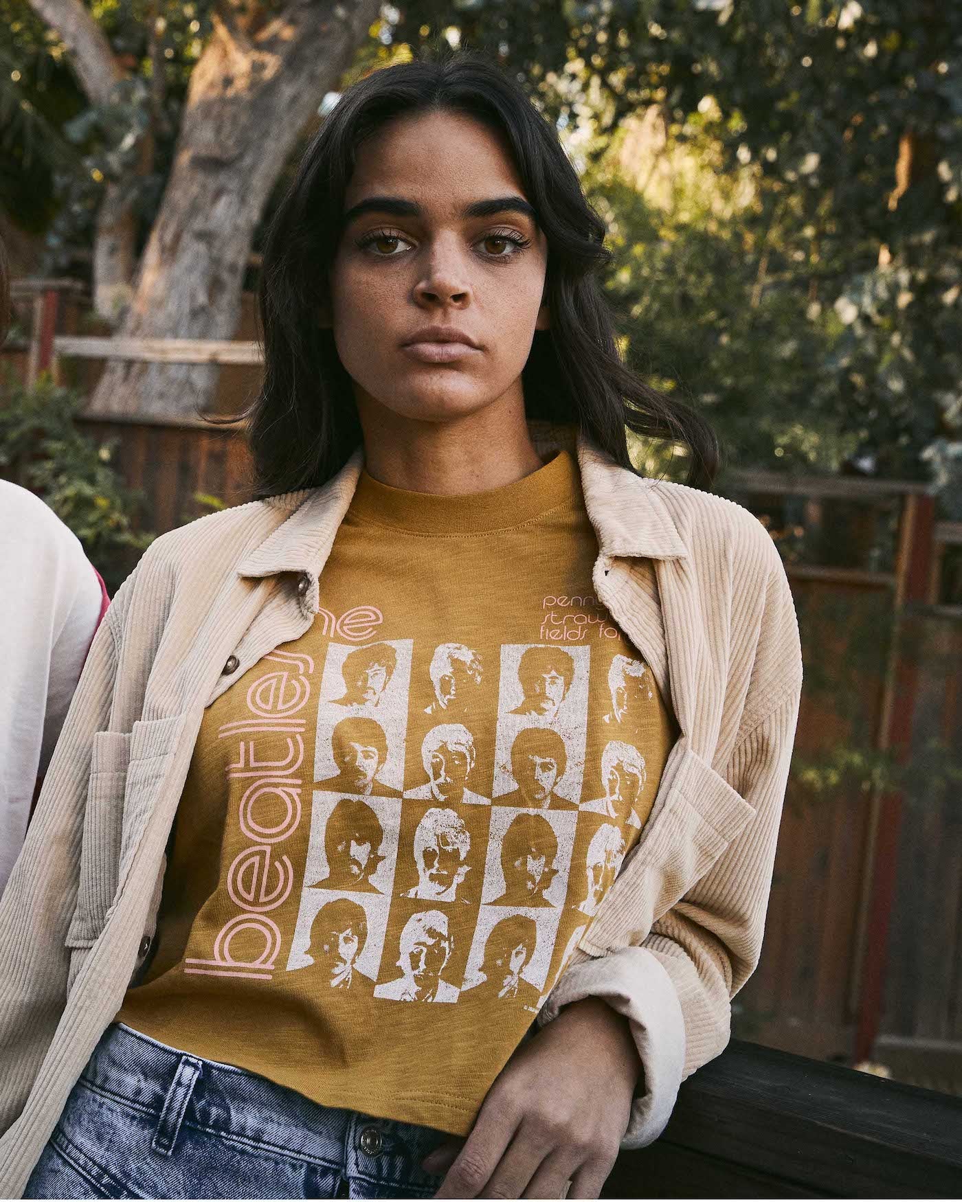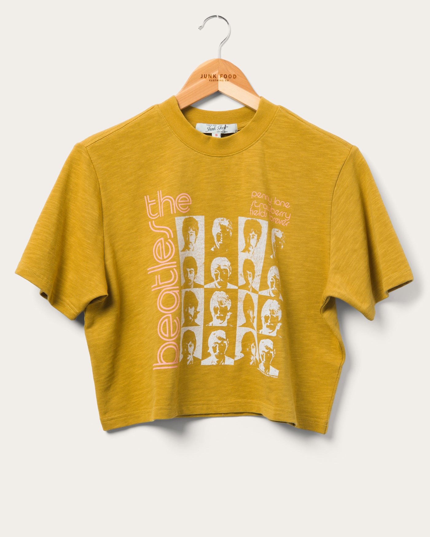 We're paying homage to the most legendary band of all time in our Beatles Strawberry Fields Cropped Mock Neck Tee. Iconic stacked portraits paired with a soft retro font, all featured on our Cropped Mock Neck Tee. Fits a little boxy & cropped at the perfect length to pair with your high-waisted jeans.