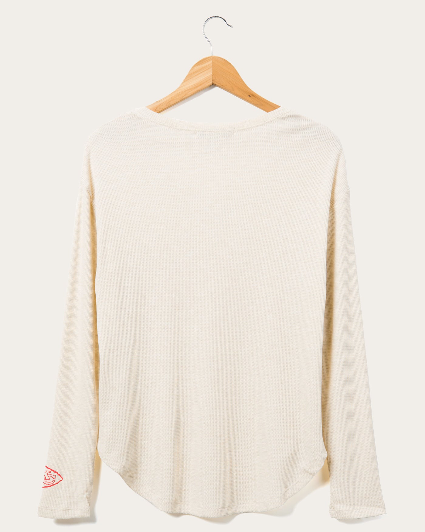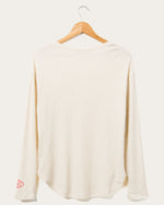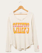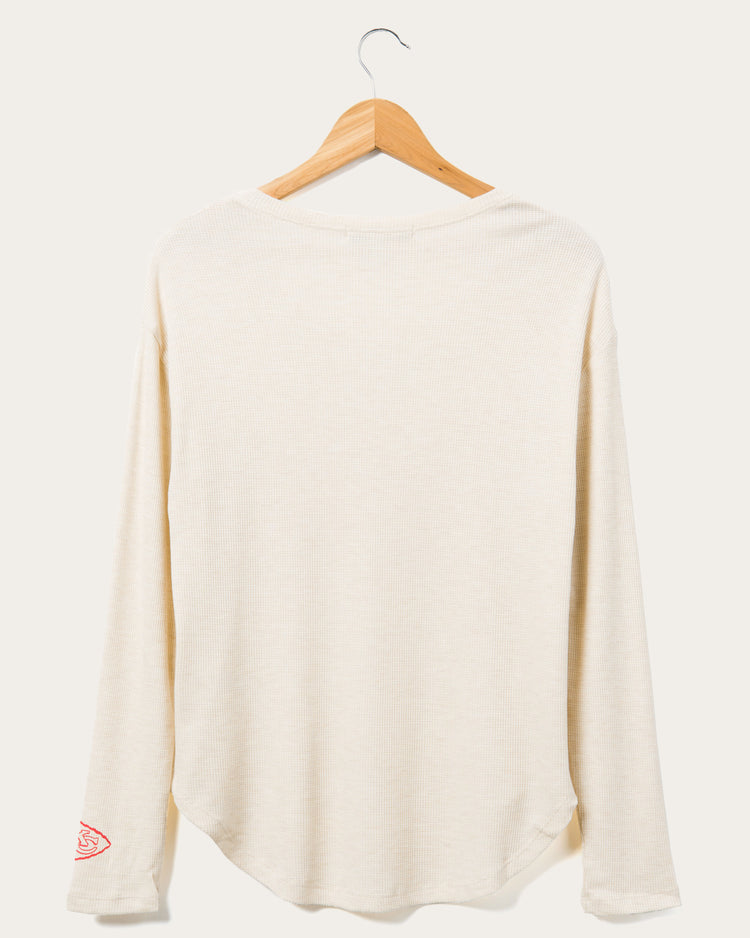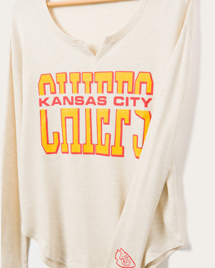 This will by far be the coziest thermal you'll ever own! Our NFL Kansas City Chiefs Sunday Thermal is the perfect long sleeve combining comfort & style to rock from the couch, bar or stadium. Made in our SUPER soft blended thermal fabric, featuring a new feminine neckline & soft-hand prints on chest & sleeve.