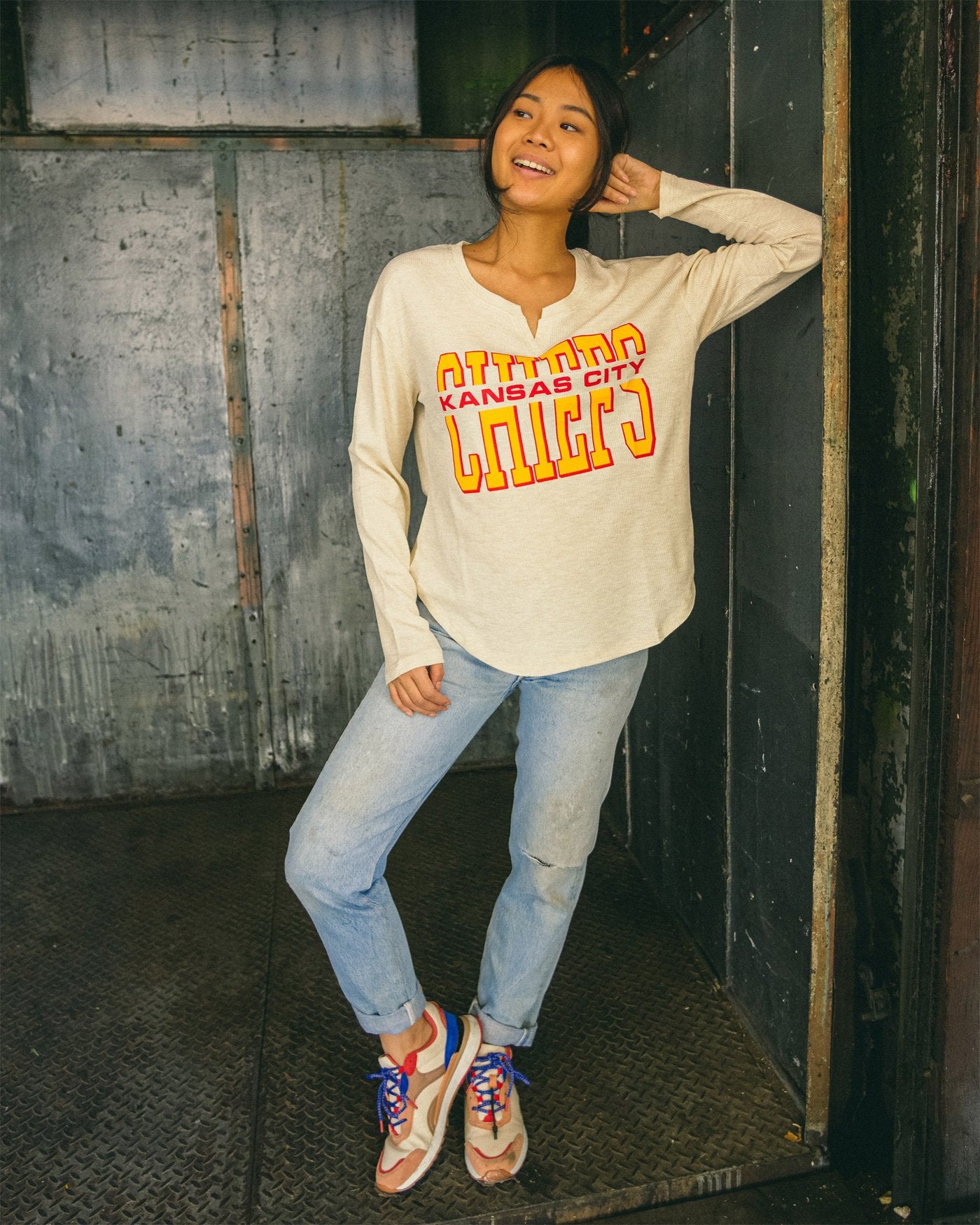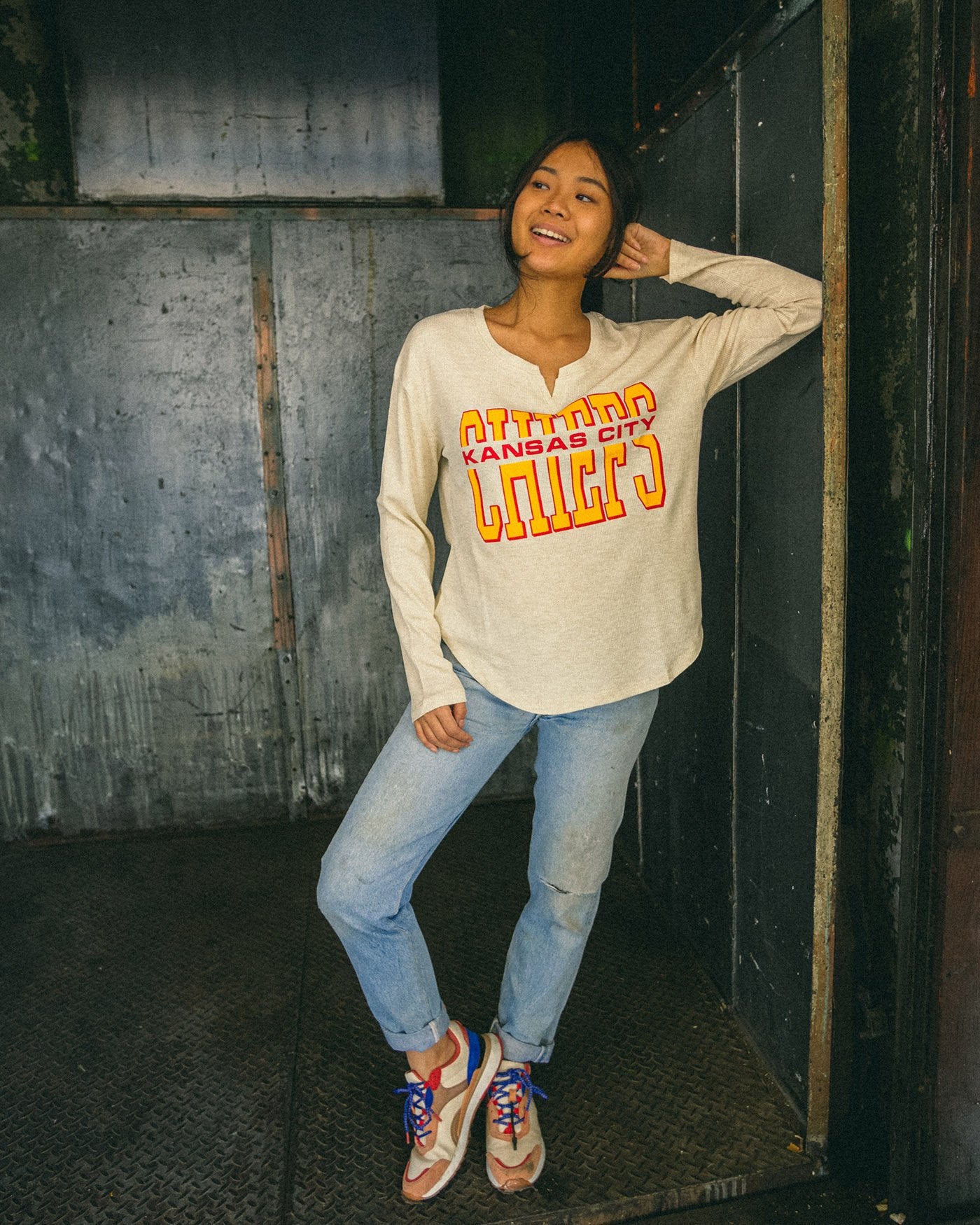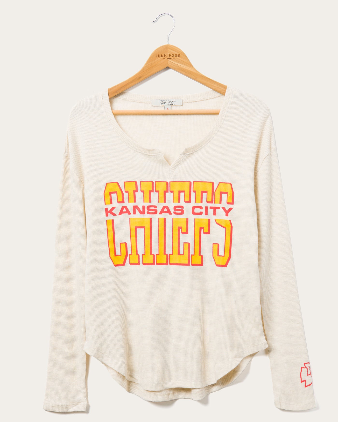 This will by far be the coziest thermal you'll ever own! Our NFL Kansas City Chiefs Sunday Thermal is the perfect long sleeve combining comfort & style to rock from the couch, bar or stadium. Made in our SUPER soft blended thermal fabric, featuring a new feminine neckline & soft-hand prints on chest & sleeve.
