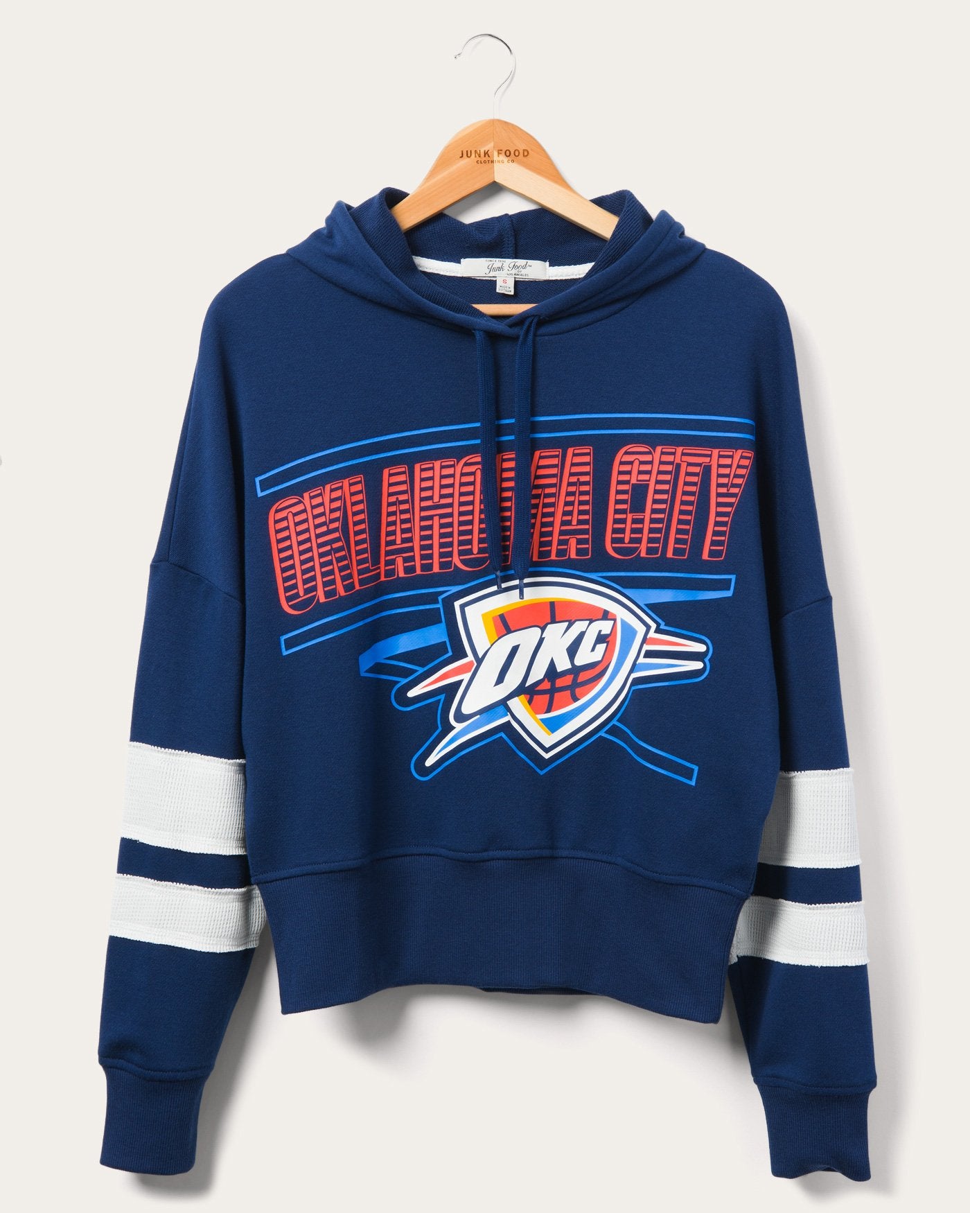 For the game days you're looking to feel stylish, but ultimately cozy. Our Women's Thunder Overtime Striped Fleece Hoodie in True Navy has got you covered for an easy throw-on piece for home, bar or arena. Made in our super soft blended French Terry & sporting a boxy, cropped fit for a modern update to your hoodie collection.
