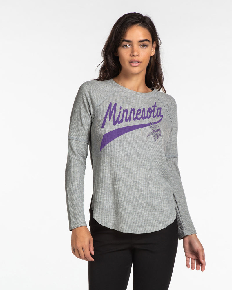 This is the coziest thermal you'll ever own! It's the perfect long sleeve tee to rock while rooting on the Vikings this season from the couch, bar or stadium. Made in our buttery-soft Modal, Poly blend thermal with raglan sleeves, rounded shirttail hem & classic script chest logo.