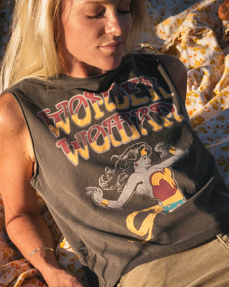 Show off your inner DC WONDER WOMAN™! Featuring a soft pigment dye and our crackle wash, this 100% cotton muscle tank will have you ready to take on the warm weather and maybe the universe too.